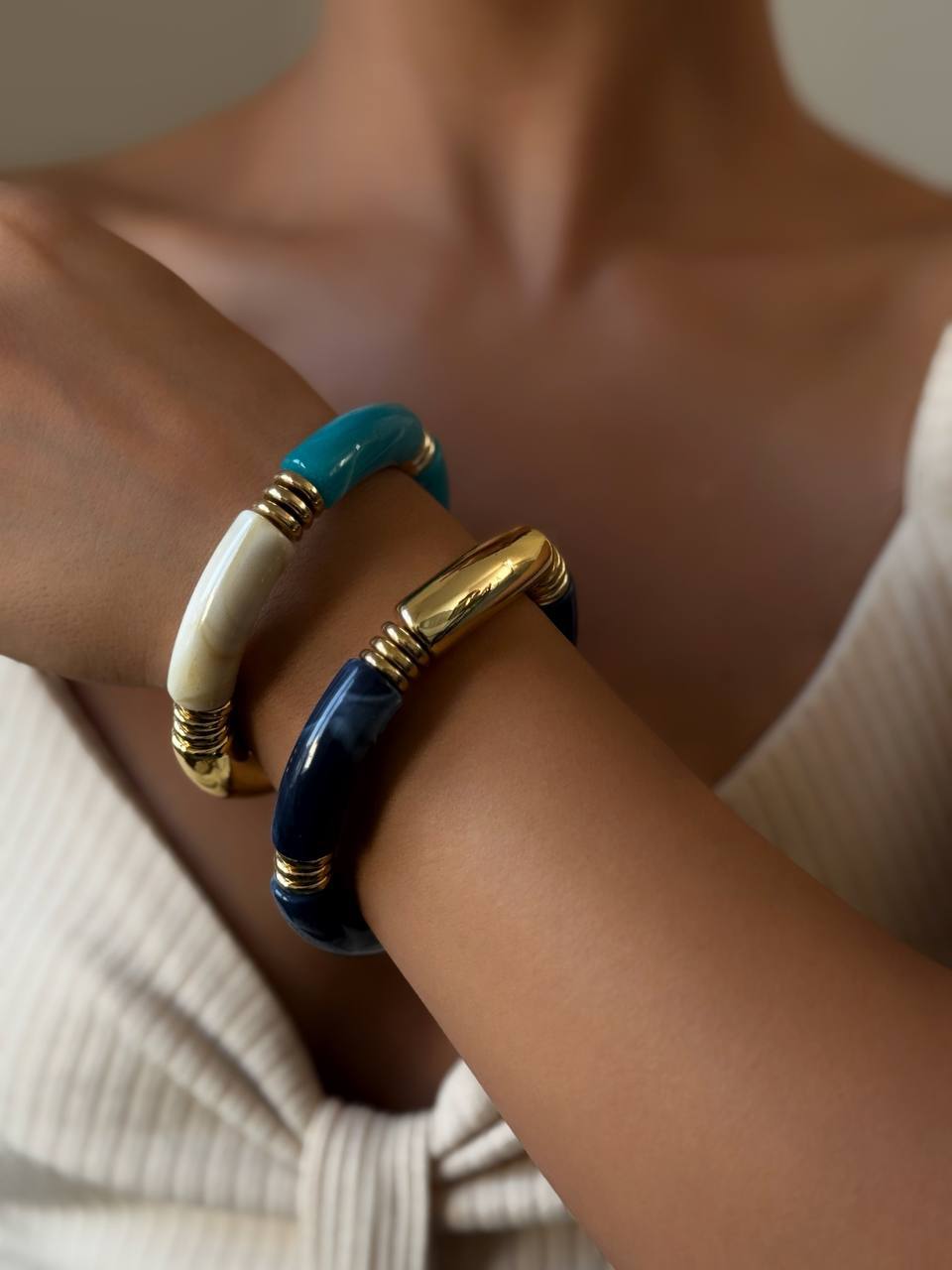 این بنگلهای لوکس و چشمگیر با ترکیب رنگی خاص و جزئیات طلایی، یک انتخاب فوقالعاده برای استایلی شیک و متفاوت هستن. طراحی منحنی و فرم جذابشون روی دست خیلی زیبا میشینه و بهراحتی با استایلهای مینیمال، روزمره یا رسمی ست میشن.